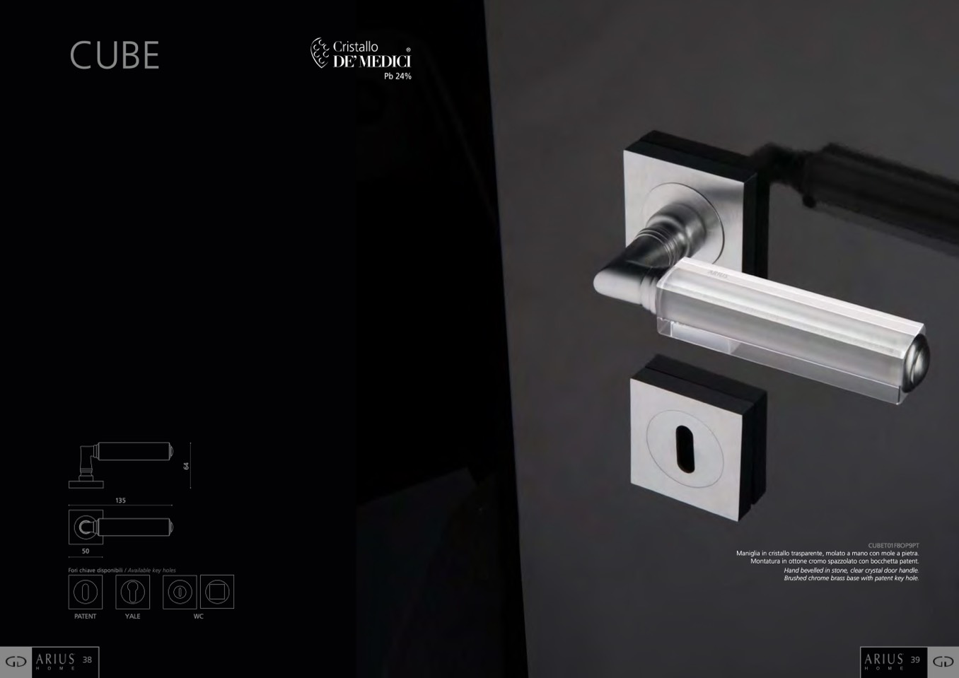 Hand bevelled in stone, clear crystal door handle.