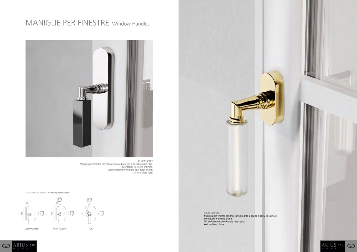 Maniglia per finestra con meccanismo anta a ribalta in cristallo satinato.