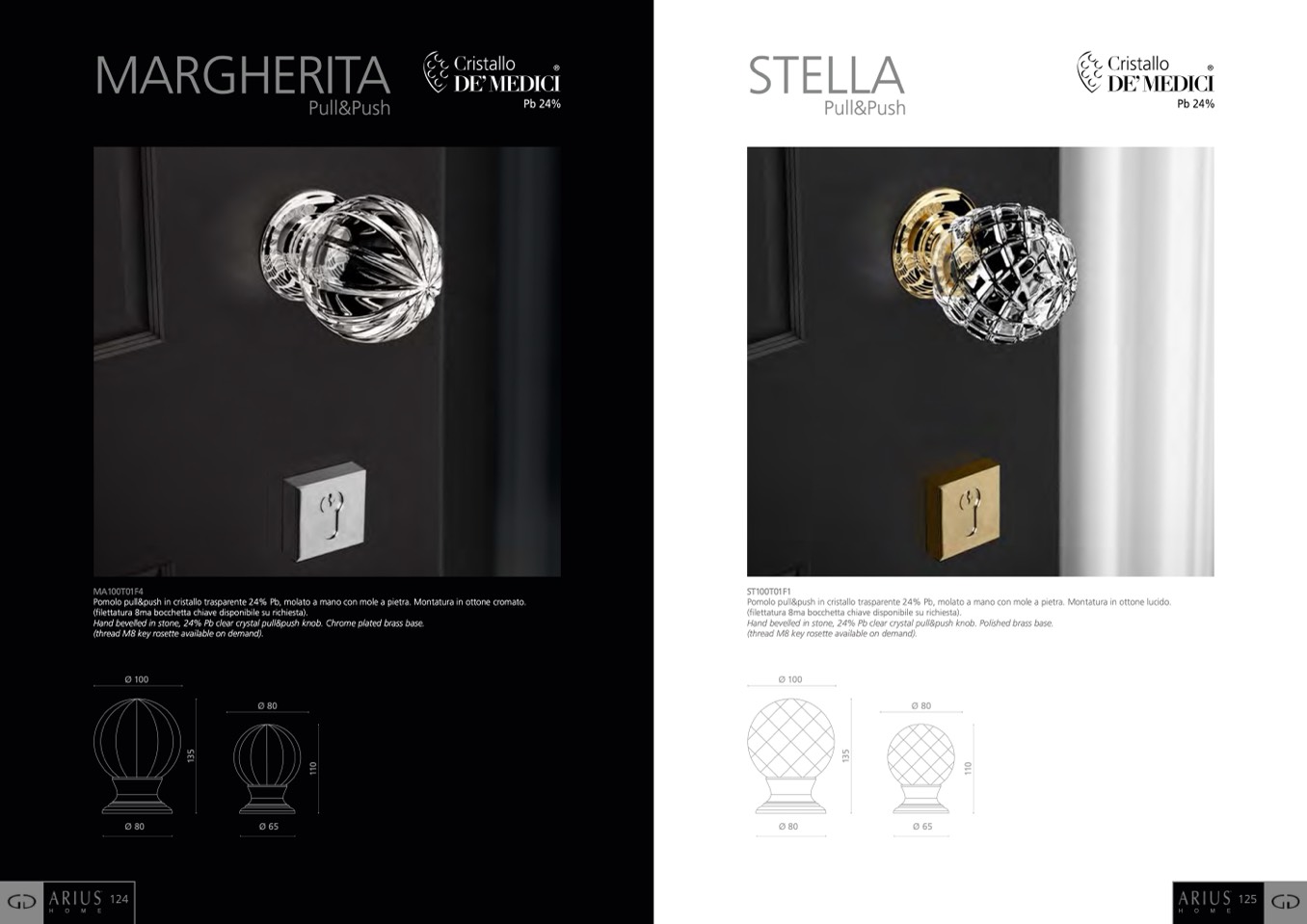 Pomolo pull&push in cristallo trasparente 24% Pb, molato a mano con mole a pietra. Montatura in ottone cromato.