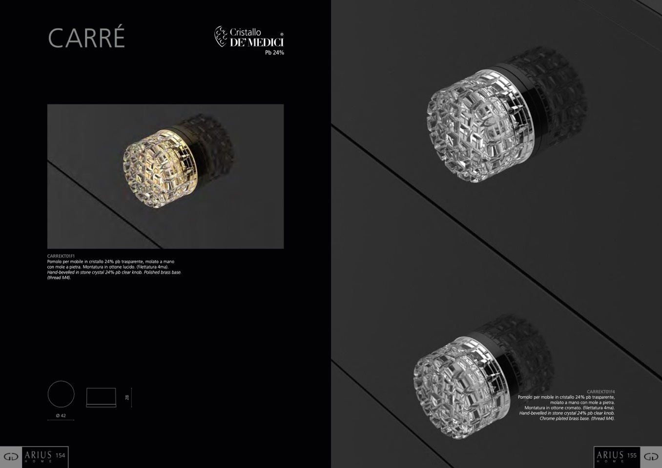 Hand-bevelled in stone crystal 24% pb clear knob. Polished brass base.