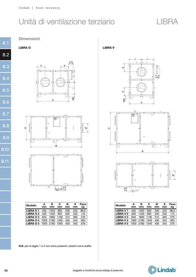 N.B. per le taglie 1 e 2 non sono presenti i piedini ma le staffe.