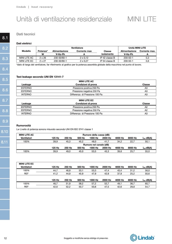 Lw Livello di potenza sonora misurato secondo UNI EN ISO 3741 classe 1