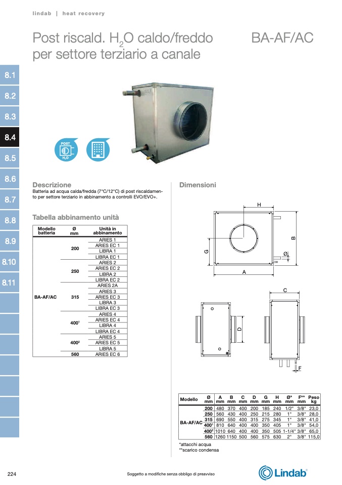 Batteria ad acqua calda/fredda (7°C/12°C) di post riscaldamen-