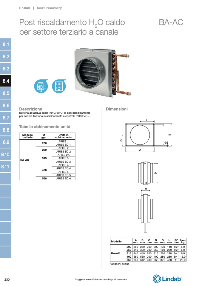 Batteria ad acqua calda (70°C/60°C) di post riscaldamento