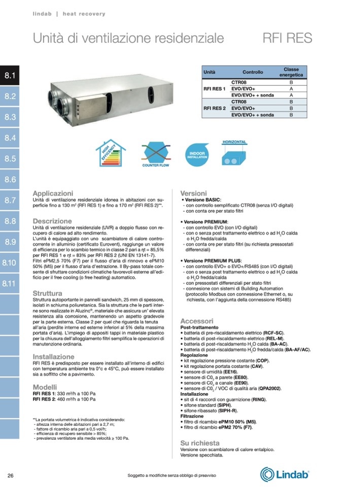 - prevalenza ventilatore alla media velocità ≥ 100 Pa.
