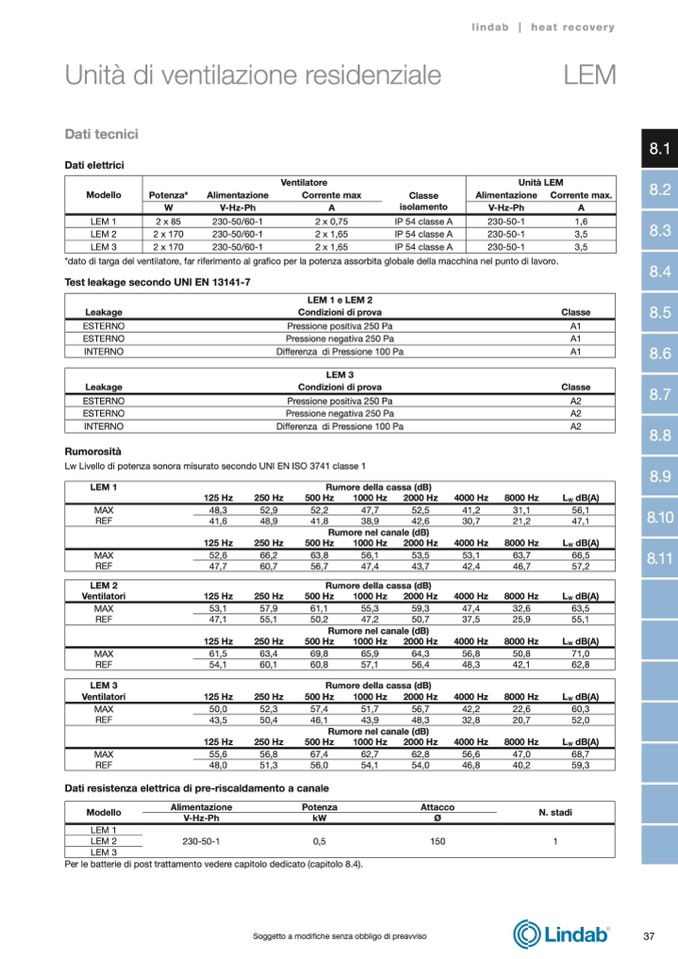 Lw Livello di potenza sonora misurato secondo UNI EN ISO 3741 classe 1
