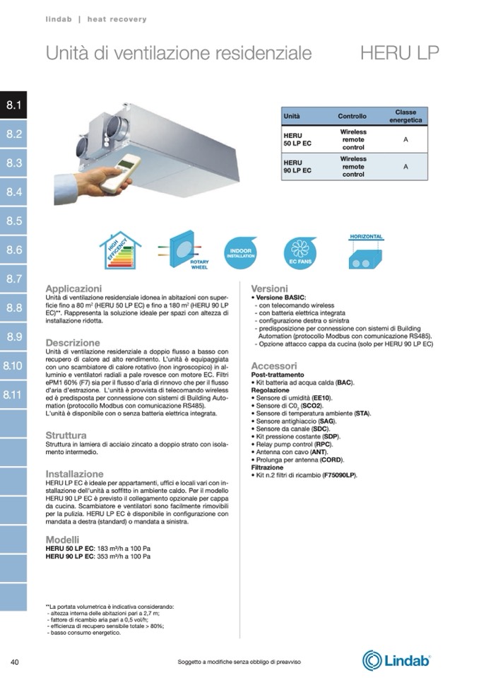- Opzione attacco cappa da cucina (solo per HERU 90 LP EC)