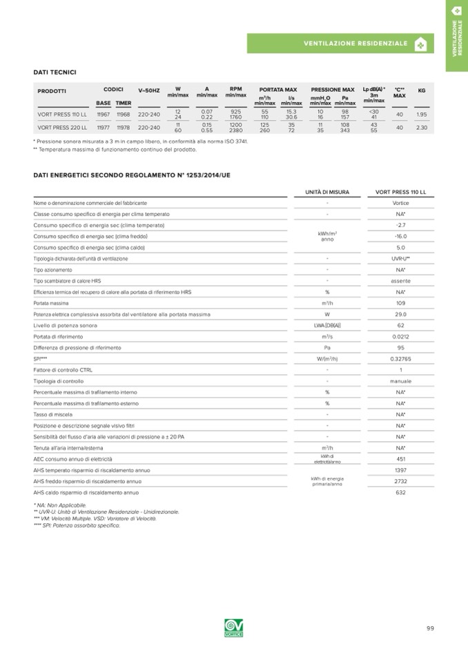 *** VM: Velocità Multiple. VSD: Variatore di Velocità.