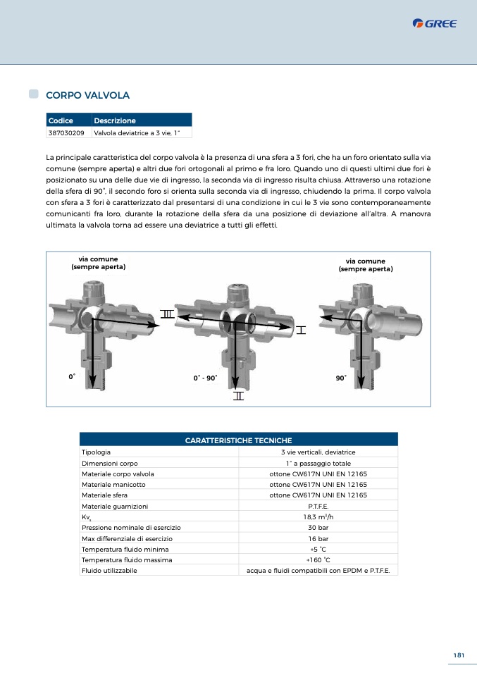 La principale caratteristica del corpo valvola è la presenza di una sfera a 3 fori, che ha un foro orientato sulla via