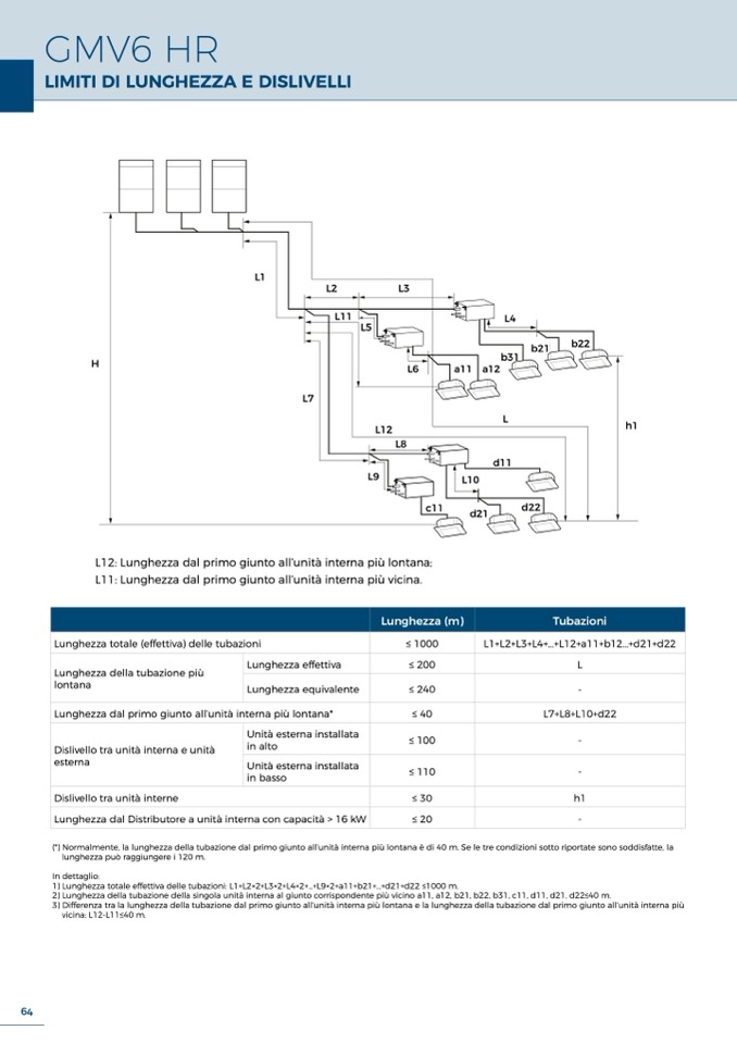 1) Lunghezza totale effettiva delle tubazioni: L1+L2×2+L3×2+L4×2+...+L9×2+a11+b21+...+d21+d22 ≤1000 m.