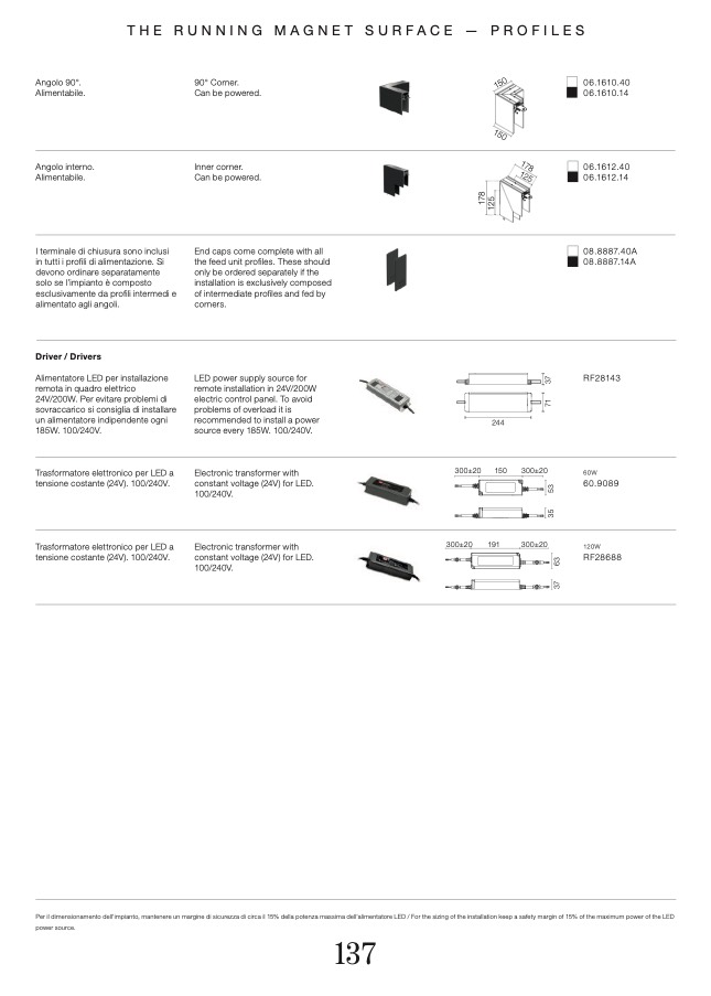 Per il dimensionamento dell'impianto, mantenere un margine di sicurezza di circa il 15% della potenza massima dell'alimentatore LED / For the sizing of the installation keep a safety margin of 15% of the maximum power of the LED