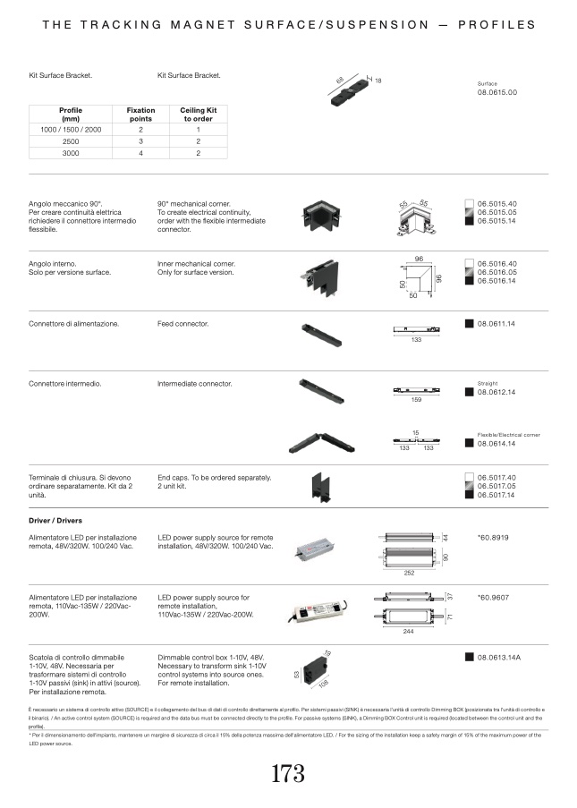 * Per il dimensionamento dell'impianto, mantenere un margine di sicurezza di circa il 15% della potenza massima dell'alimentatore LED. / For the sizing of the installation keep a safety margin of 15% of the maximum power of the