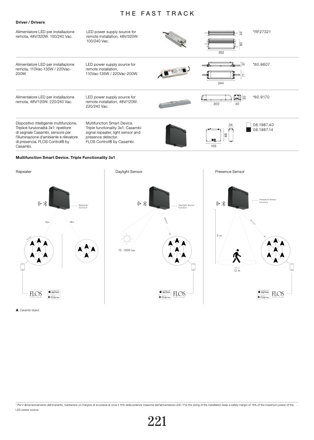 * Per il dimensionamento dell'impianto, mantenere un margine di sicurezza di circa il 15% della potenza massima dell'alimentatore LED / For the sizing of the installation keep a safety margin of 15% of the maximum power of the