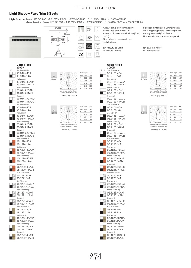 Light Source: Power LED DC 900 mA 21,6W - 2160 lm - 2700K/CRI 90 / 21,6W - 2280 lm - 3000K/CRI 90