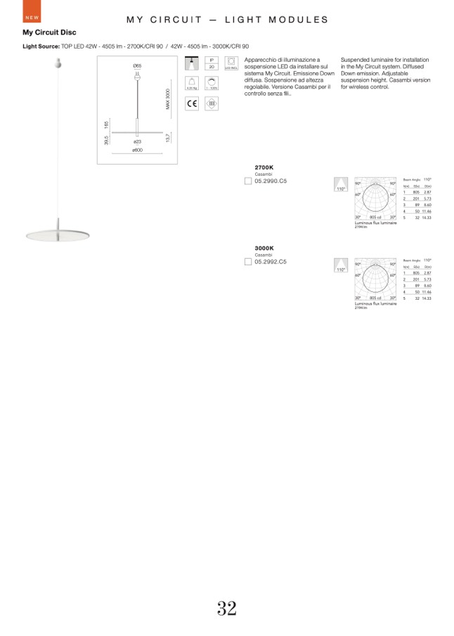 Light Source: TOP LED 42W - 4505 lm - 2700K/CRI 90 / 42W - 4505 lm - 3000K/CRI 90