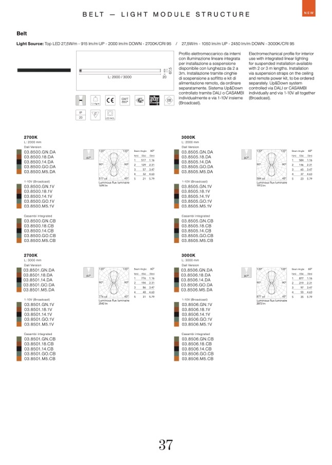 Light Source: Top LED 27,5W/m - 915 lm/m UP - 2000 lm/m DOWN - 2700K/CRI 95