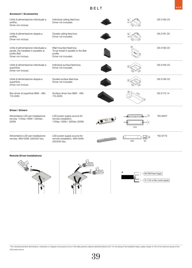 * Per il dimensionamento dell'impianto, mantenere un margine di sicurezza di circa il 15% della potenza massima dell'alimentatore LED / For the sizing of the installation keep a safety margin of 15% of the maximum power of the