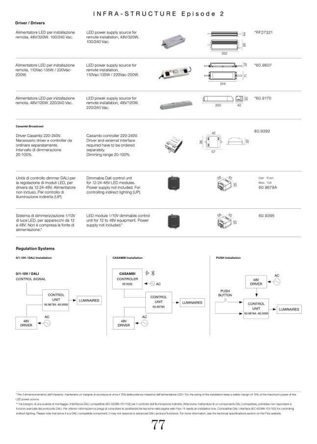 * Per il dimensionamento dell'impianto, mantenere un margine di sicurezza di circa il 15% della potenza massima dell'alimentatore LED / For the sizing of the installation keep a safety margin of 15% of the maximum power of the