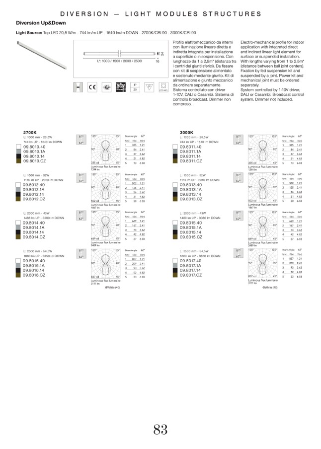 Light Source: Top LED 20,5 W/m - 744 lm/m UP - 1540 lm/m DOWN - 2700K/CRI 90 - 3000K/CRI 90