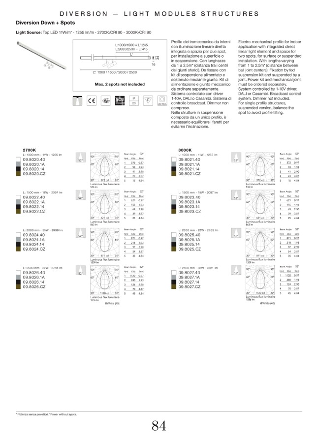 Light Source: Top LED 11W/m* - 1255 lm/m - 2700K/CRI 90 - 3000K/CRI 90