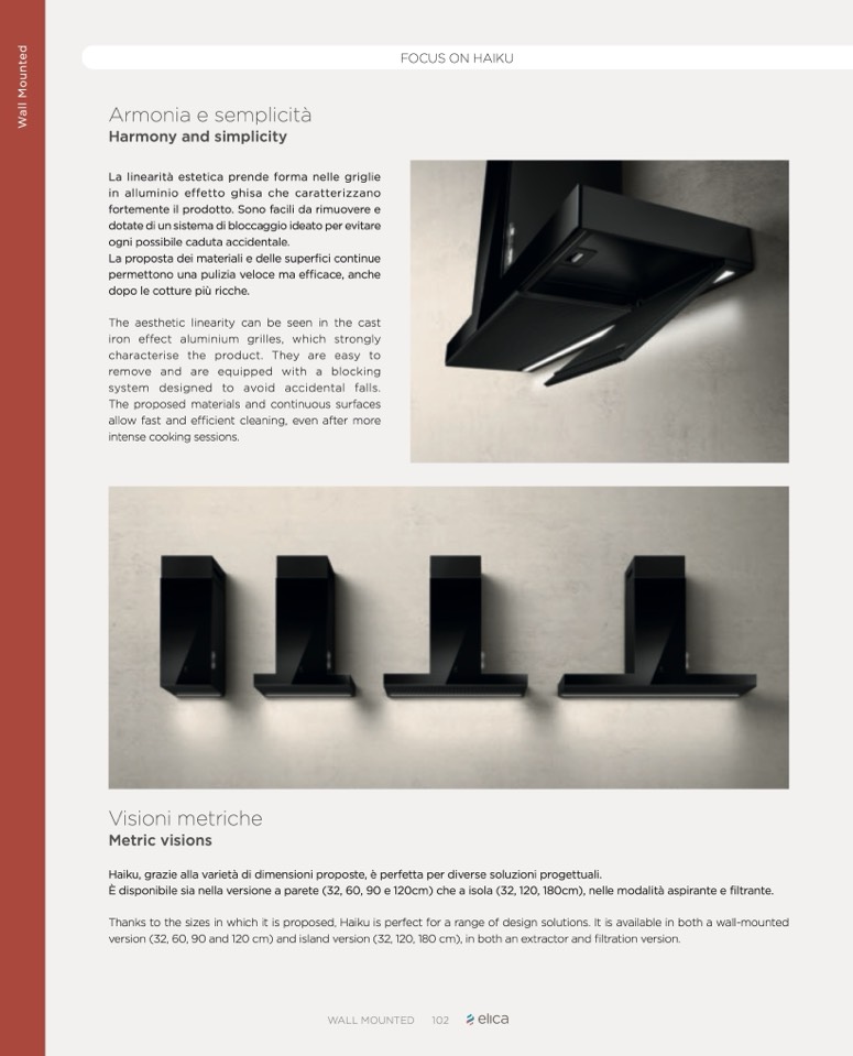 È disponibile sia nella versione a parete (32, 60, 90 e 120cm) che a isola (32, 120, 180cm), nelle modalità aspirante e filtrante.