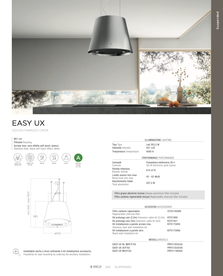 Installabile anche a muro ordinando il kit installazione accessorio.