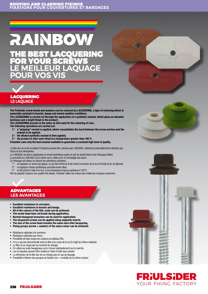 La tête des vis et les rondelles Friulsider peuvent être colorées par LAQUAGE, traitement particulièrement résistant aux
