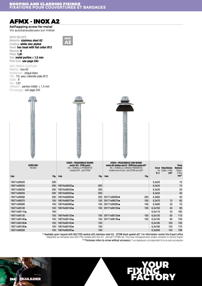 Available upon request with BAZ PRO washer ø25 stainless steel A2 - EPDM black gasket ø27. For information contact the Export office