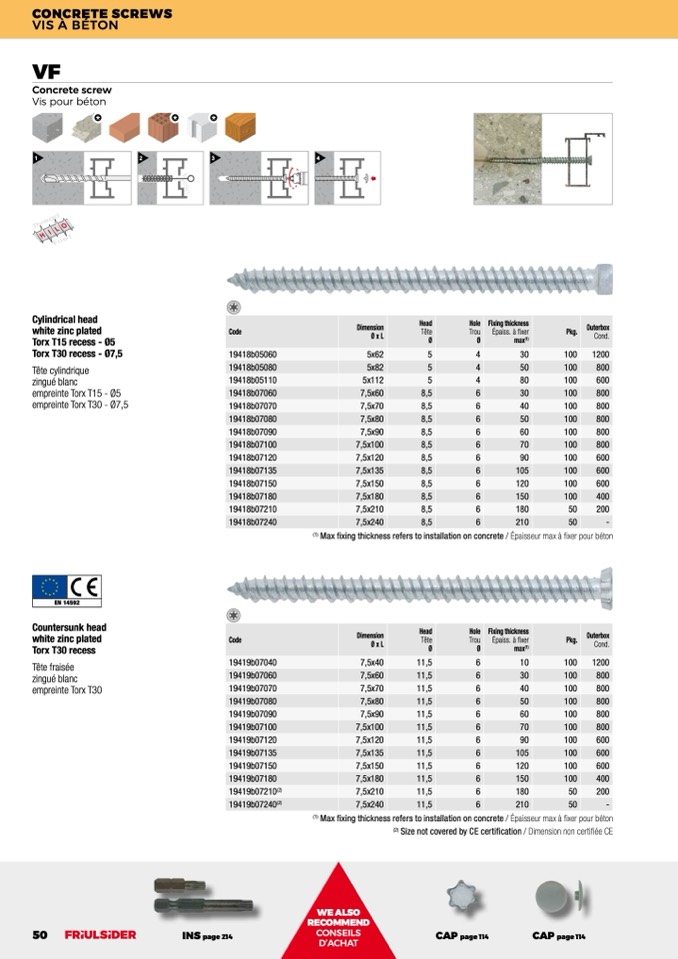Max fixing thickness refers to installation on concrete / Épaisseur max à fixer pour béton