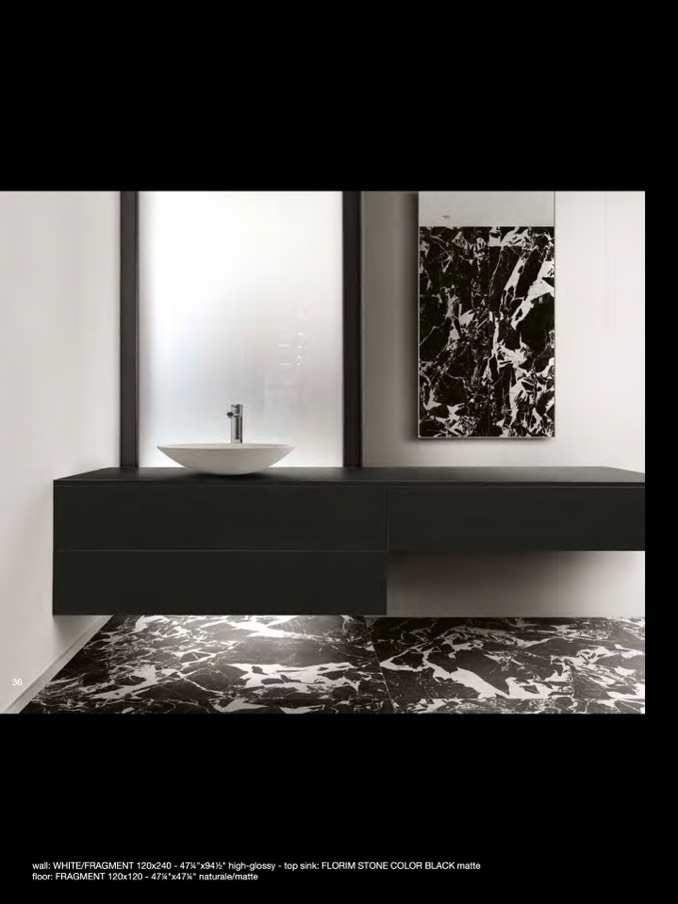 wall: WHITE/FRAGMENT 120x240 - 474"x942" high-glossy - top sink: FLORIM STONE COLOR BLACK matte