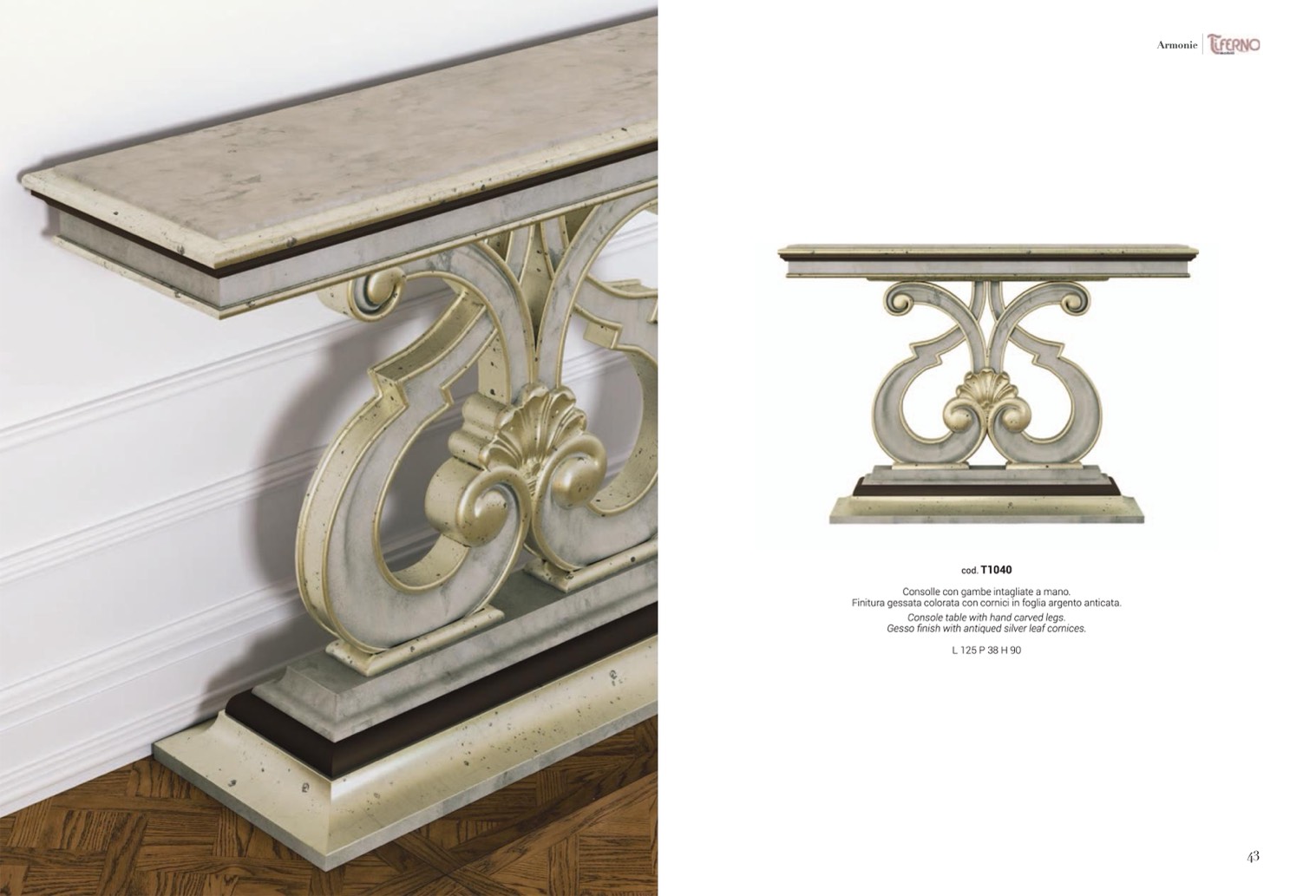 Finitura gessata colorata con cornici in foglia argento anticata.