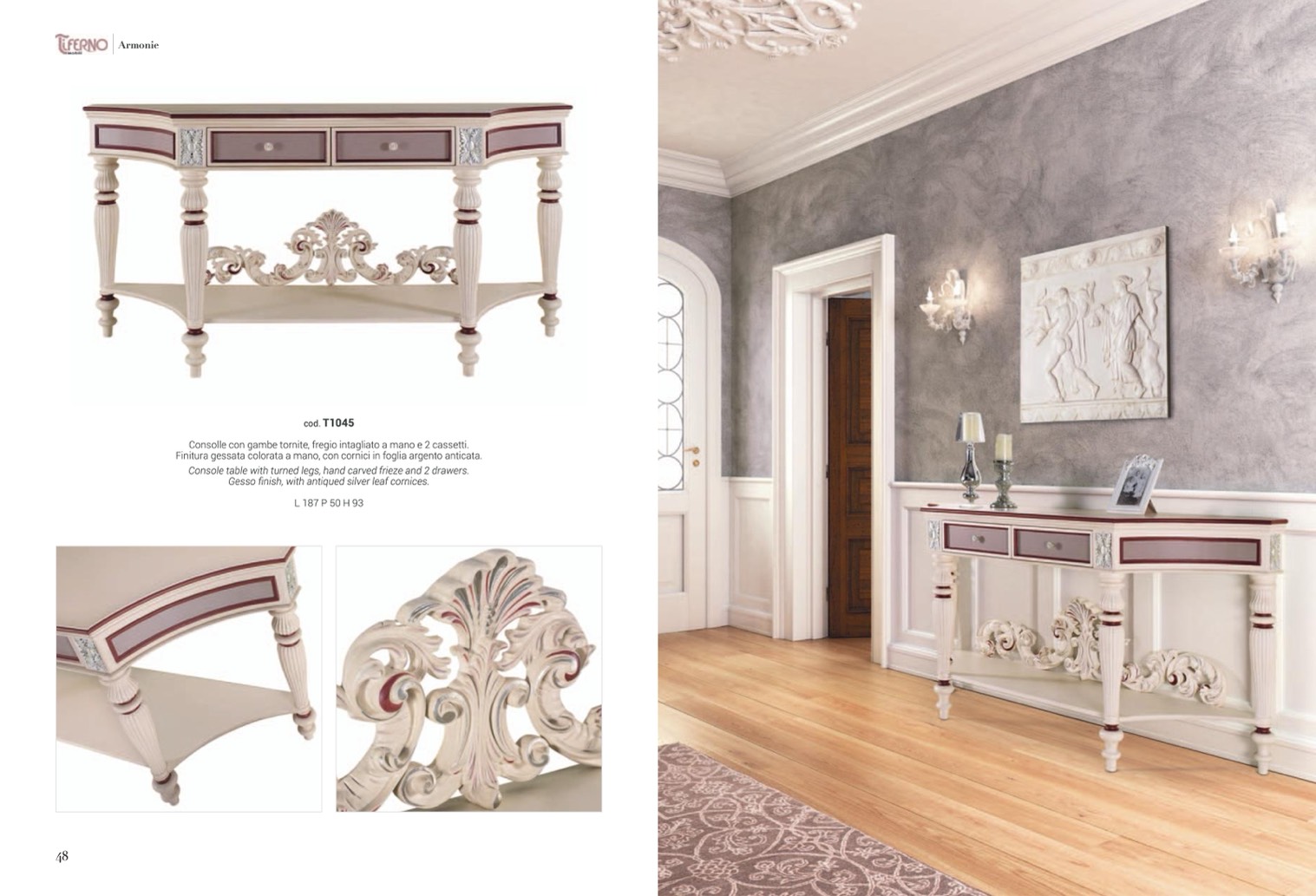 Finitura gessata colorata a mano, con cornici in foglia argento anticata.