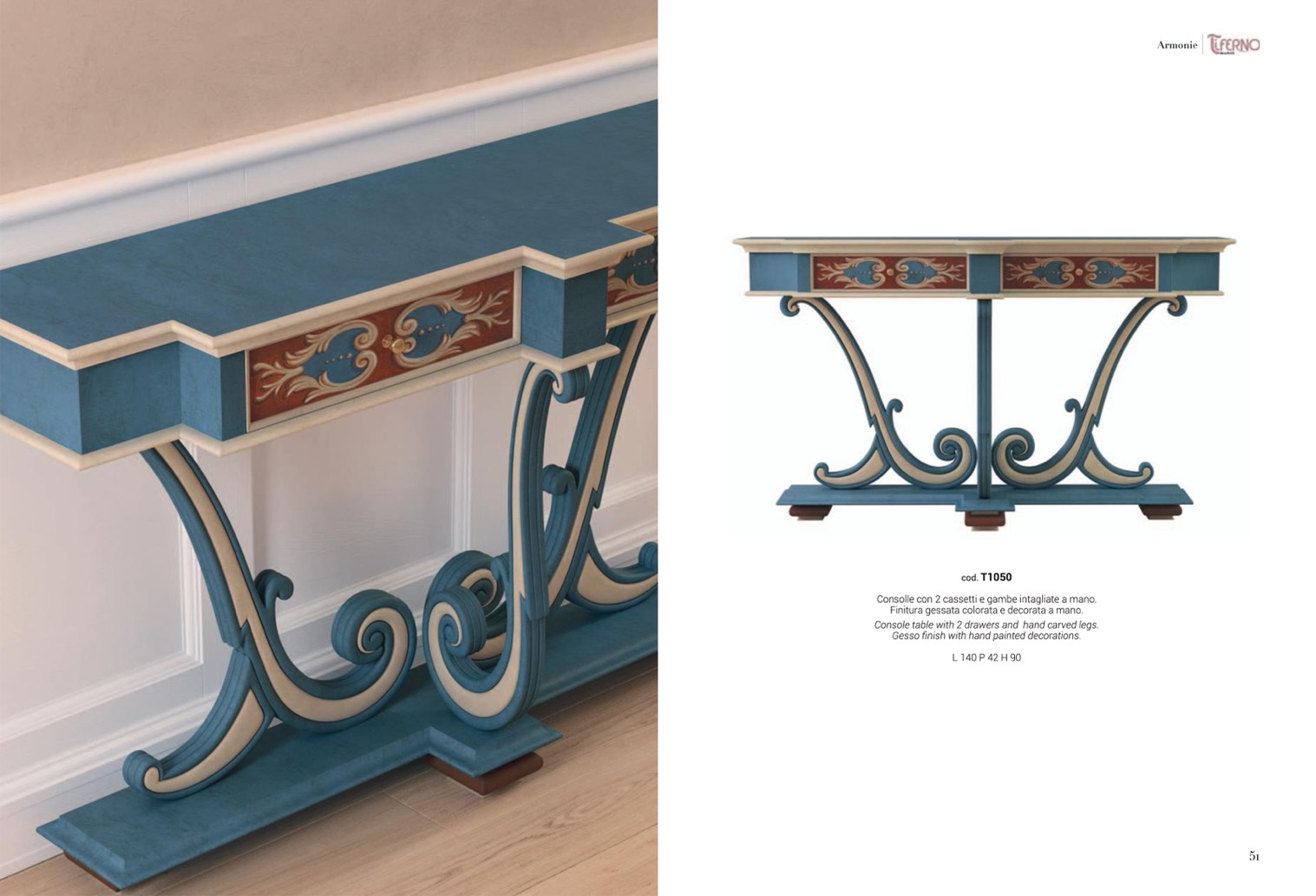 Finitura gessata colorata e decorata a mano.