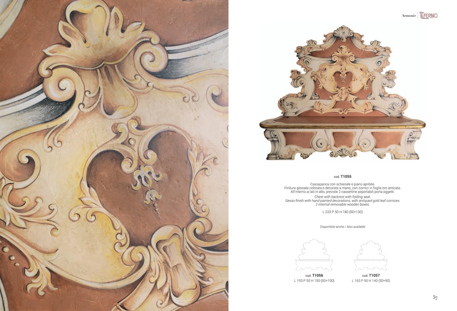 Finitura gessata colorata e decorata a mano, con cornici in foglia oro anticata.