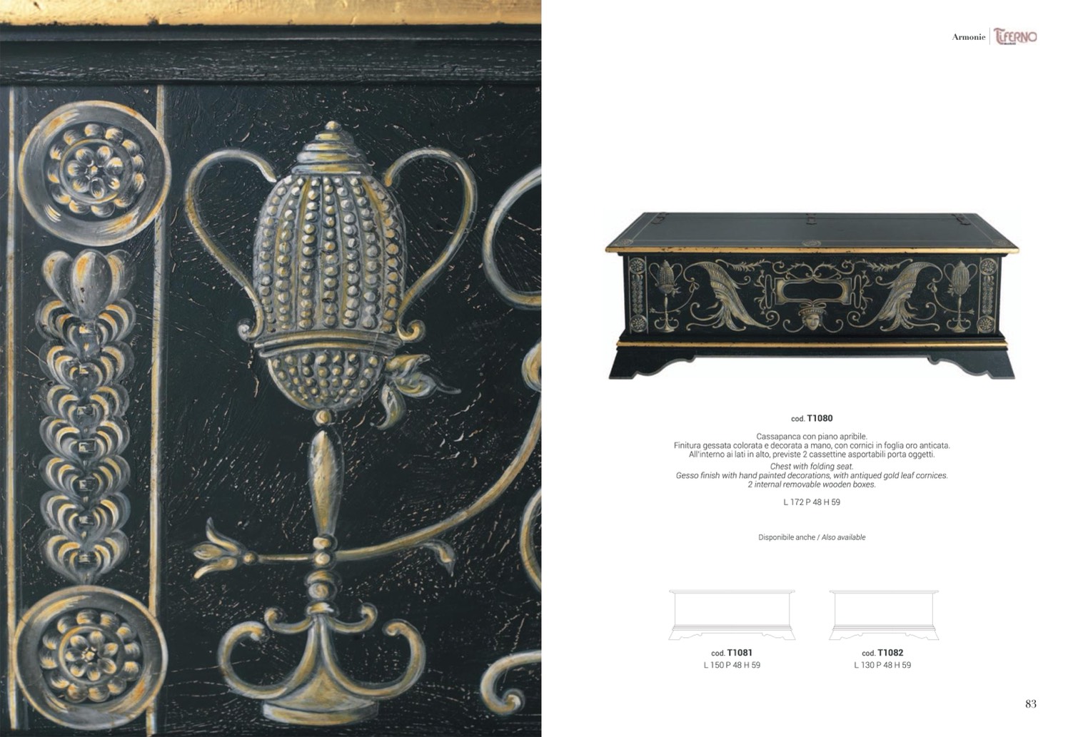 Finitura gessata colorata e decorata a mano, con cornici in foglia oro anticata.