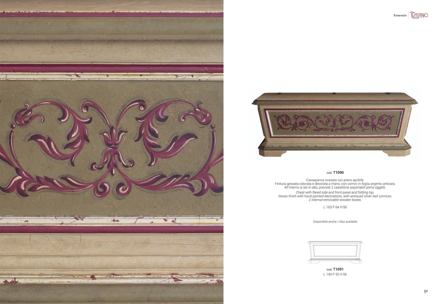 Finitura gessata colorata e decorata a mano, con cornici in foglia argento anticata.