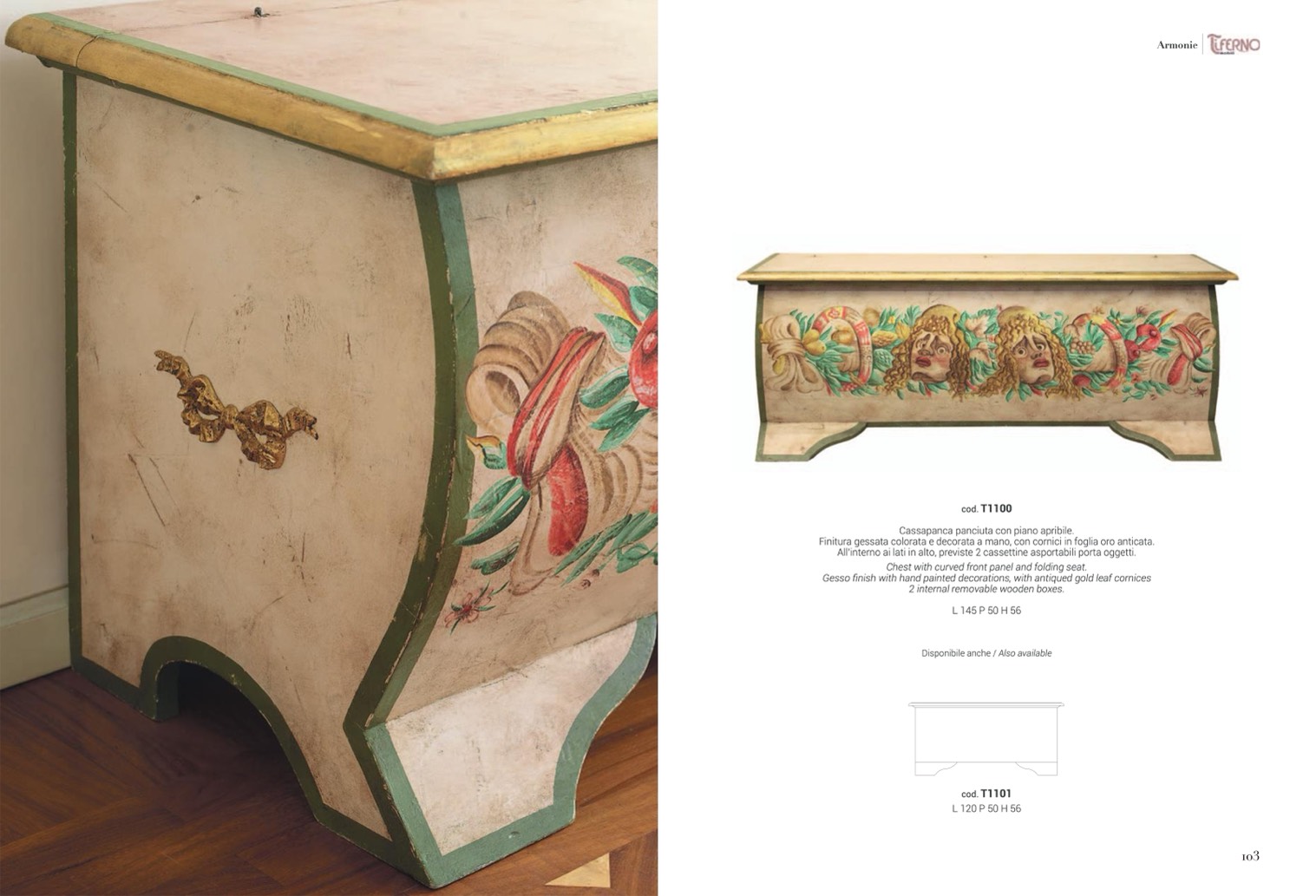 Finitura gessata colorata e decorata a mano, con cornici in foglia oro anticata.