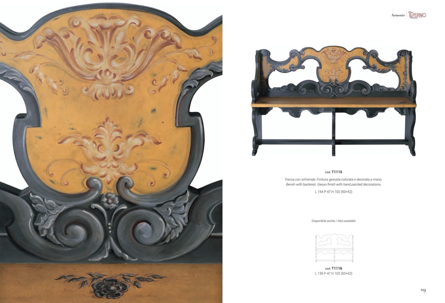 Panca con schienale. Finitura gessata colorata e decorata a mano.