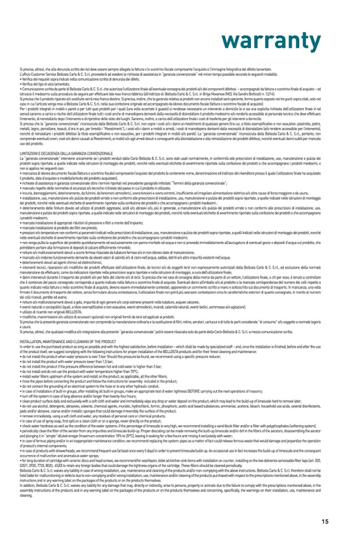 Si precisa che la presente garanzia convenzionale non comprende la manutenzione ordinaria e la sostituzione di filtri, retine, aeratori, cartucce e di tutte le parti considerate “di consumo” e/o soggette a normale logorio