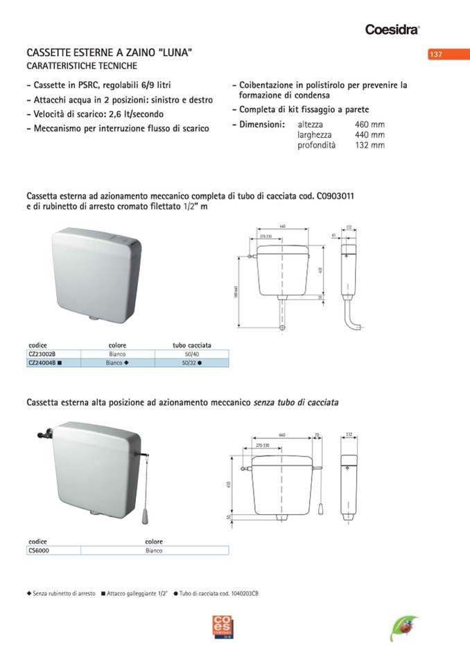 Cassetta esterna alta posizione ad azionamento meccanico senza tubo di cacciata