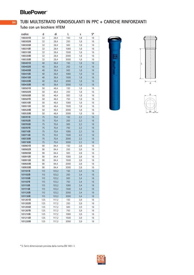 * S: Serie dimensionale prevista dalla norma EN 1451-1.