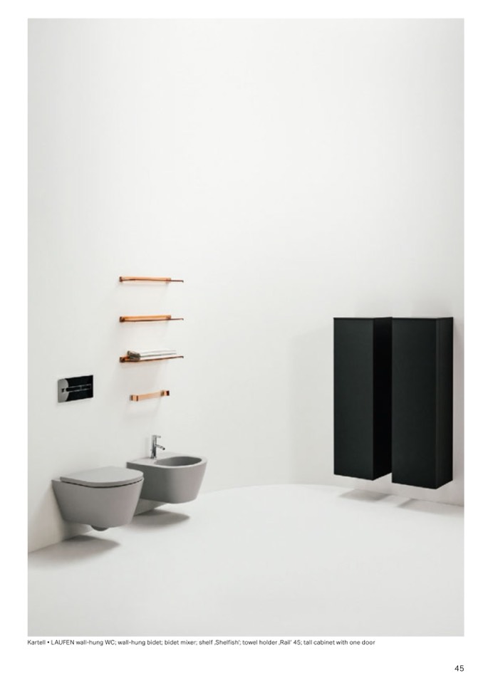 Kartell • LAUFEN wall-hung WC; wall-hung bidet; bidet mixer; shelf ‚Shelfish‘; towel holder ‚Rail‘ 45; tall cabinet with one door