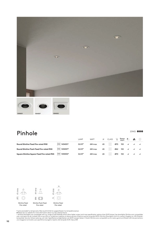 * Slimline downlights are compatible with our range of LED Modules which allow higher output and more specification options than GU10 lamps./ Les downlights Slimline sont compatibles