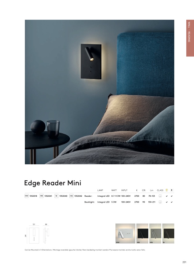 Can be Mounted in 3 Orientations / Montage reversible (gauche / droite) / Kann beidseitig montiert werden / Può essere montato anche rivolto verso l’alto.