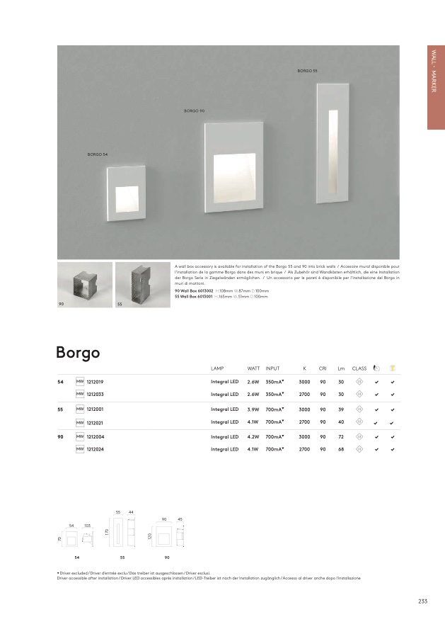 A wall box accessory is available for installation of the Borgo 55 and 90 into brick walls / Accesoire mural disponible pour