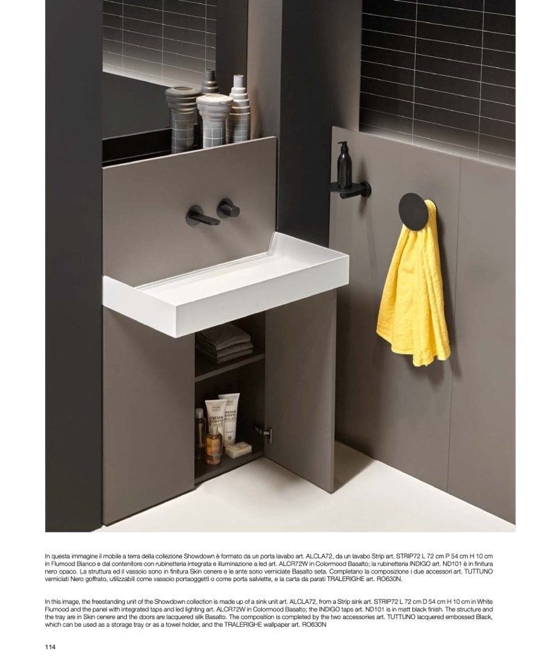 in Flumood Bianco e dal contenitore con rubinetteria integrata e illuminazione a led art. ALCR72W in Colormood Basalto; la rubinetteria INDIGO art. ND101 è in finitura