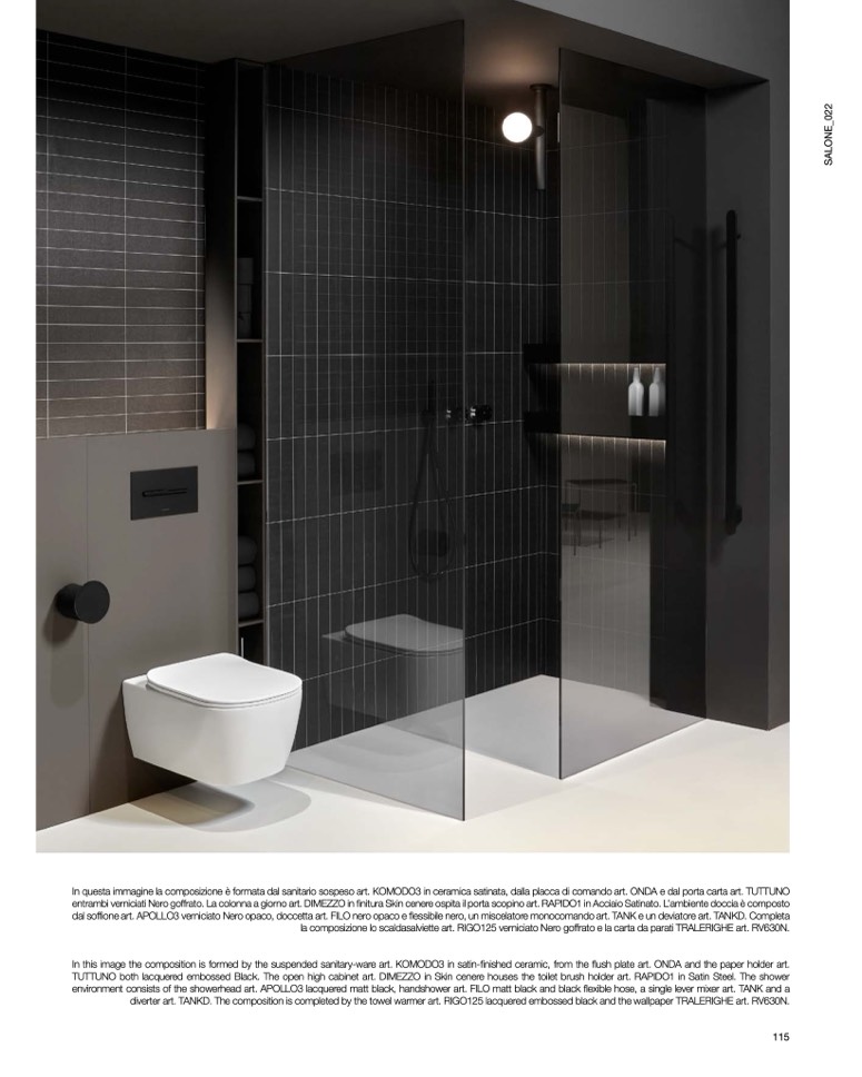 entrambi verniciati Nero goffrato. La colonna a giorno art. DIMEZZO in finitura Skin cenere ospita il porta scopino art. RAPIDO1 in Acciaio Satinato. L’ambiente doccia è composto