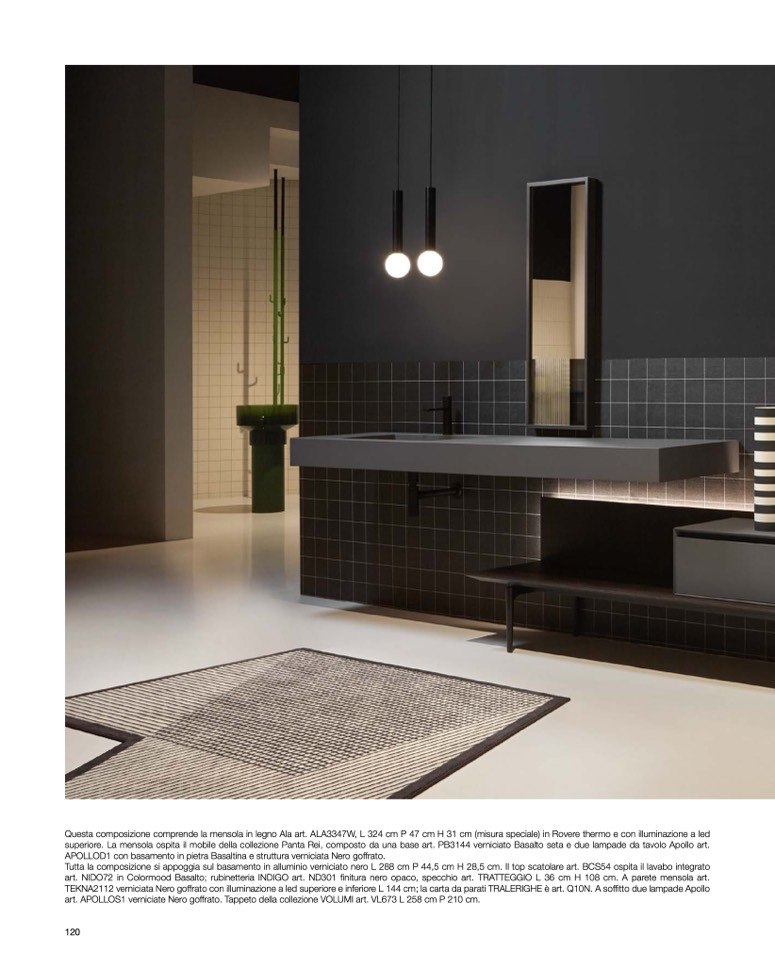 superiore. La mensola ospita il mobile della collezione Panta Rei, composto da una base art. PB3144 verniciato Basalto seta e due lampade da tavolo Apollo art.