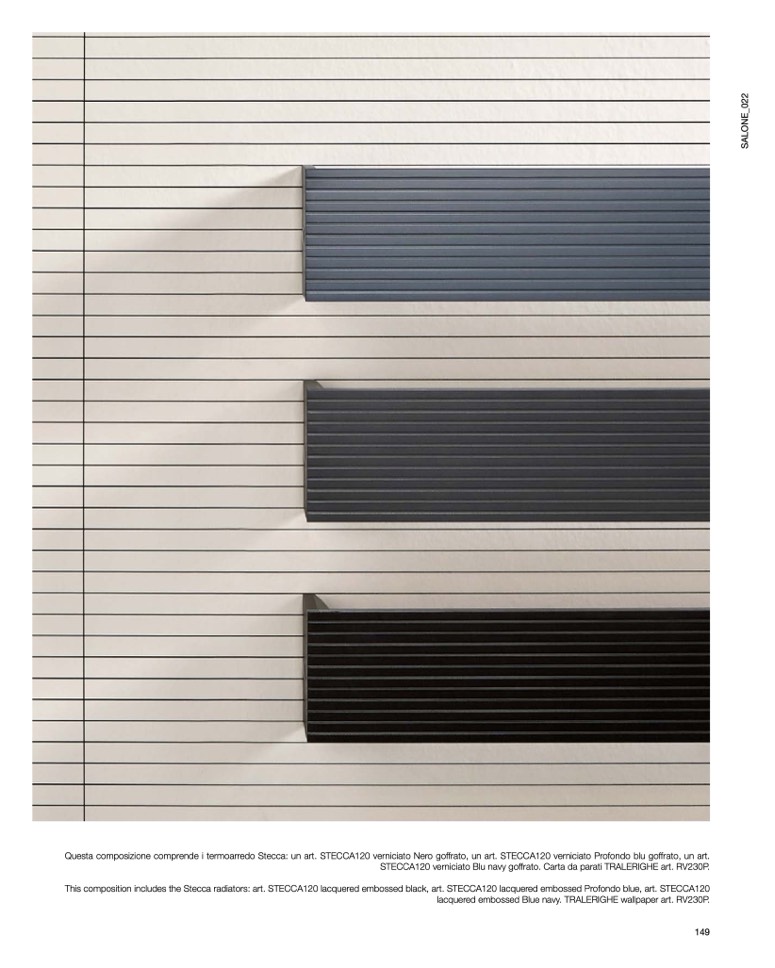 This composition includes the Stecca radiators: art. STECCA120 lacquered embossed black, art. STECCA120 lacquered embossed Profondo blue, art. STECCA120