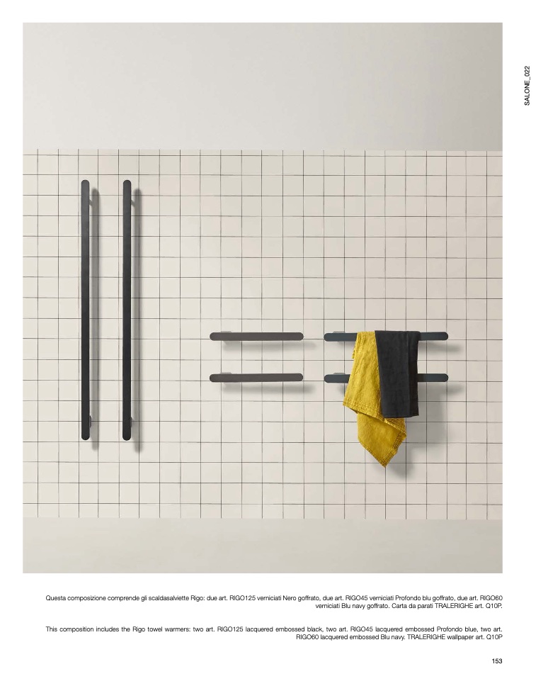 This composition includes the Rigo towel warmers: two art. RIGO125 lacquered embossed black, two art. RIGO45 lacquered embossed Profondo blue, two art.
